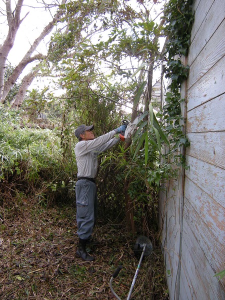 敷地境界沿いに生えてしまったクマザサの刈取りと樹木の伐採を承りました。