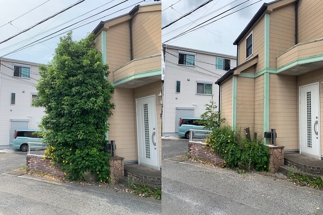 自然に花壇に生え、伸びてしまった樹木の伐採と抜根を承りました。