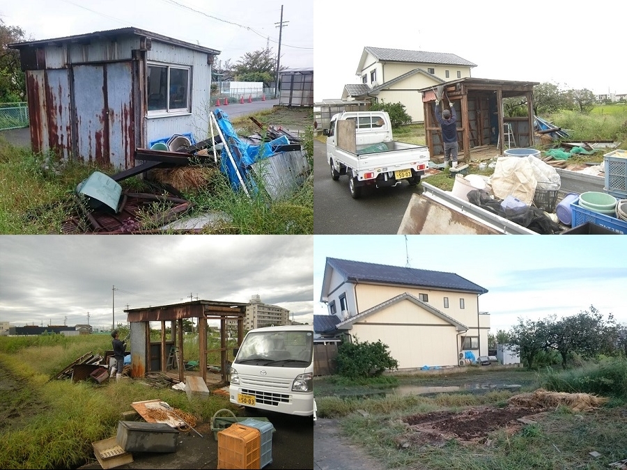 台風で屋根の一部が吹き飛んでしまった市民菜園にある農機具用の小屋を撤去いたしました。