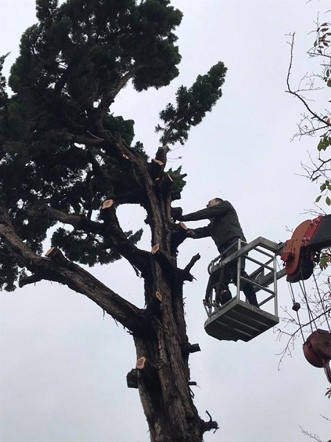 作業員が搭乗できるカゴを備えたユニック車で枝落しの上、伐採を致しました。